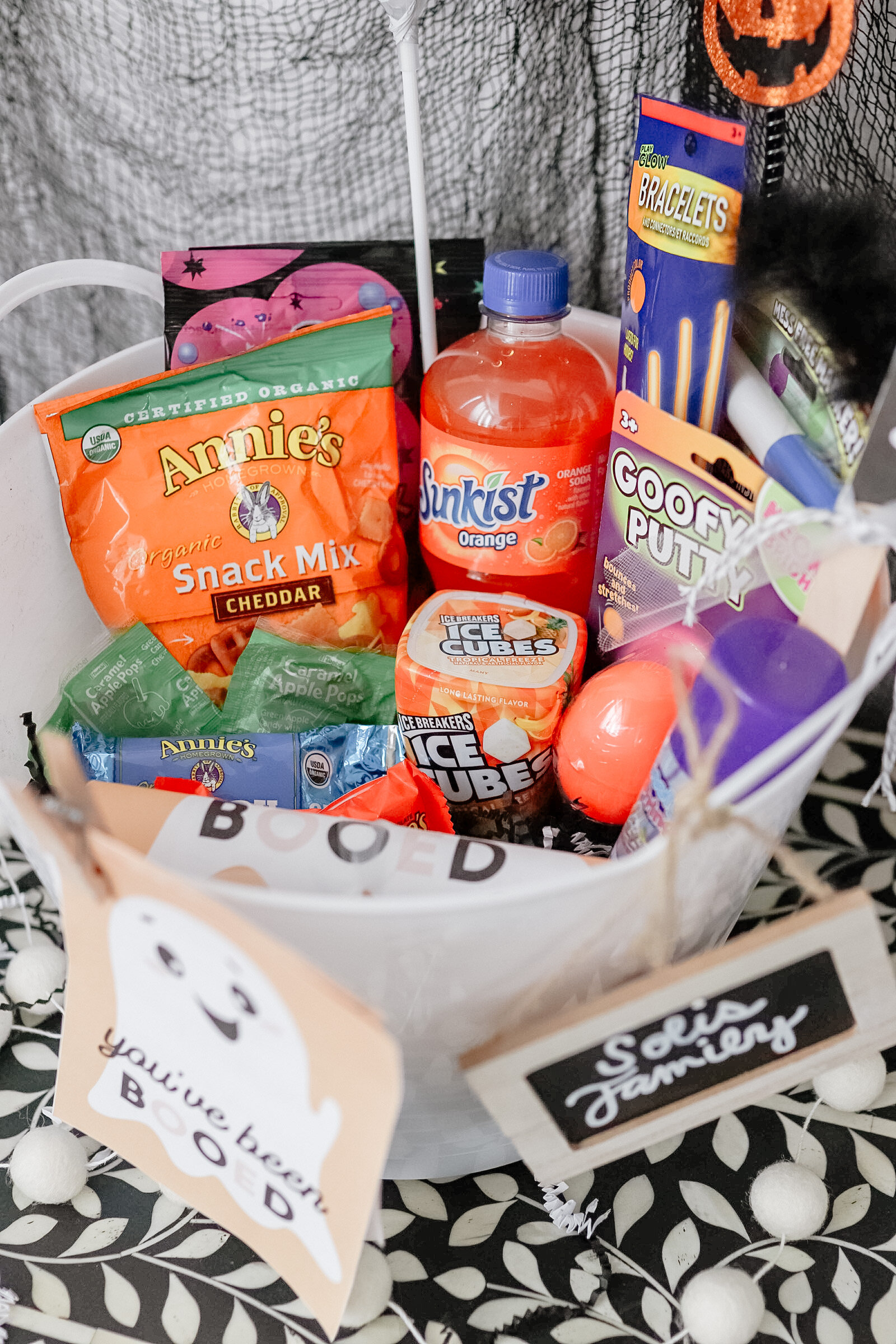 The Boo Basket of Snacks. This basket screams traditional Halloween to me. Here are a few ideas for what to put in the spooky basket.